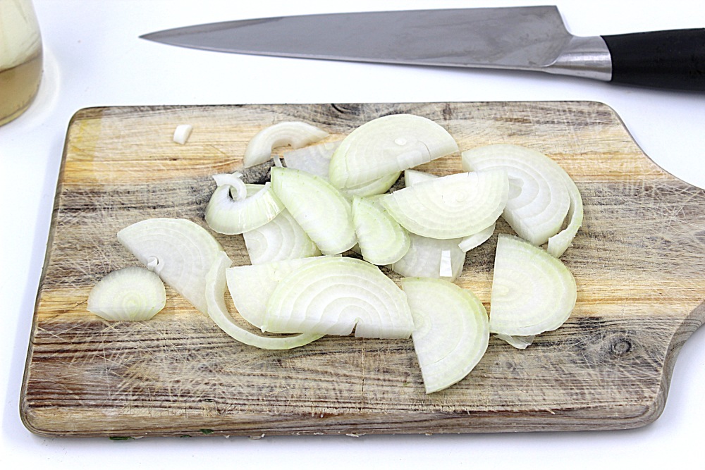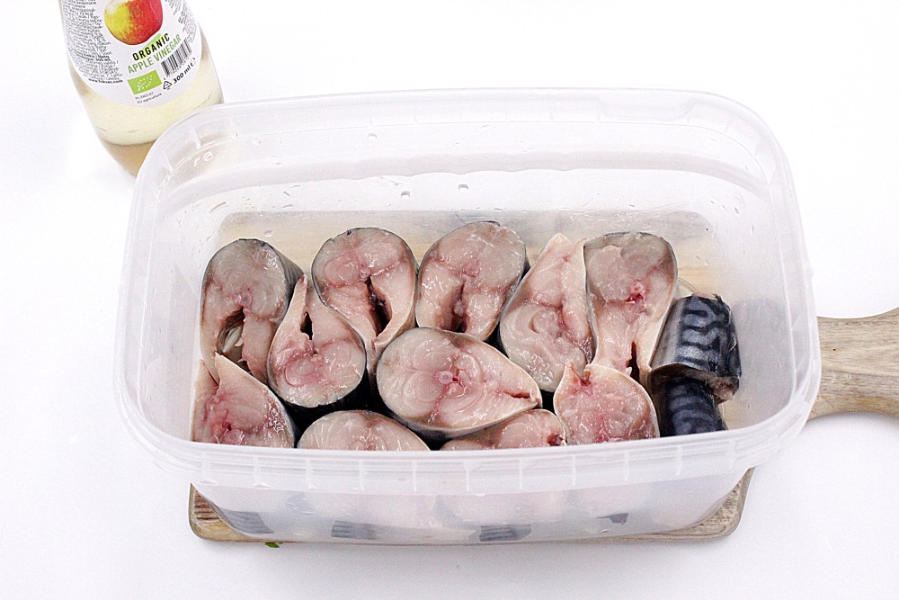 Нарезать скумбрию на кусочки, толщиной примерно 3 сантиметра.