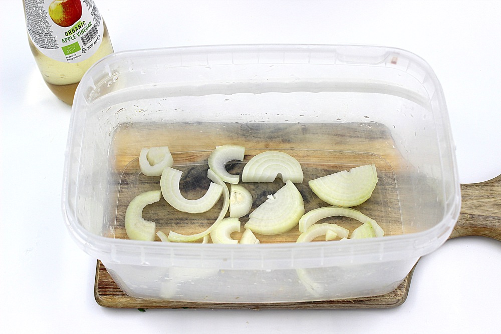 Далее вторая половина лука и остывший маринад. Закрыть и выдержать в холодильнике сутки.