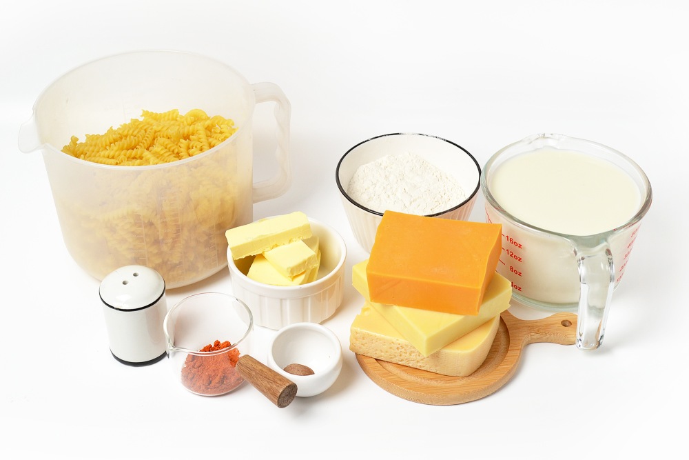Подготовить ингредиенты: макароны, 2-3 вида сыра, молоко, масло, немного муки, паприку и специи.