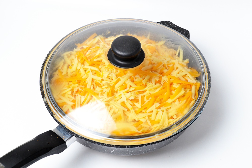 Накрыть крышкой, поставить на средний огонь или чуть меньше (3/6 для электроплиты) и довести до расплавления верхнего сыра. Не открывайте крышку, чтобы не выпускать горячий воздух.