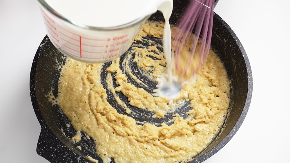Влить холодное молоко, постоянно и интенсивно перемешивая венчиком. На огне выше среднего довести до загустения и появления первых пузырей кипения, не забывая постоянно перемешивать.