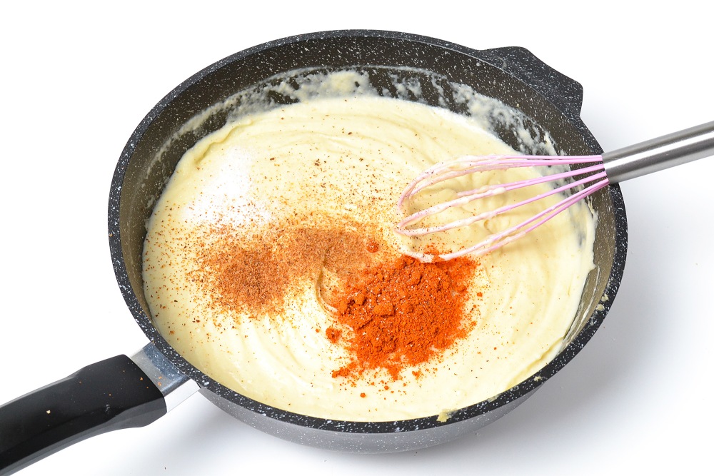 Добавить мускатный орех и паприку, поперчить и хорошо перемешать.