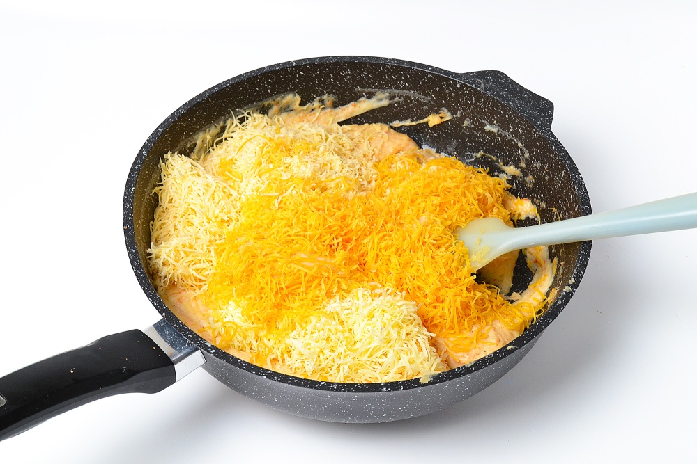 Добавить мелко натертый сыр и, тщательно перемешивая лопаткой, нагреть на среднем огне до полного растворения сыра (3/6 для электроплиты).