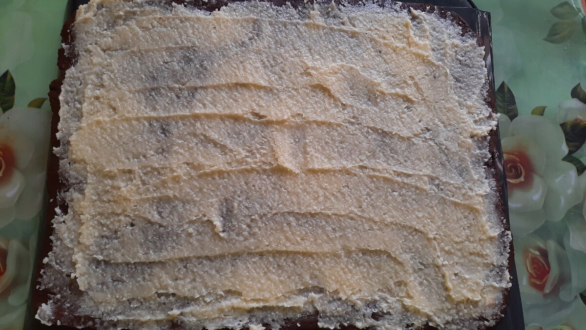 Смазываем тесто кремом. Удобно воспользоваться силиконовой лопаткой, а если такой нет, то и обычная столовая ложка подойдёт.
