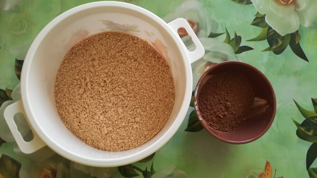 Добавляем какао и перемешиваем. Добиваемся однородного тёмного цвета. Если цвет кажется бледноватым, добавьте ещё какой. Желательно брать какао без сахара, чтобы не сделать десерт излишне сладким.