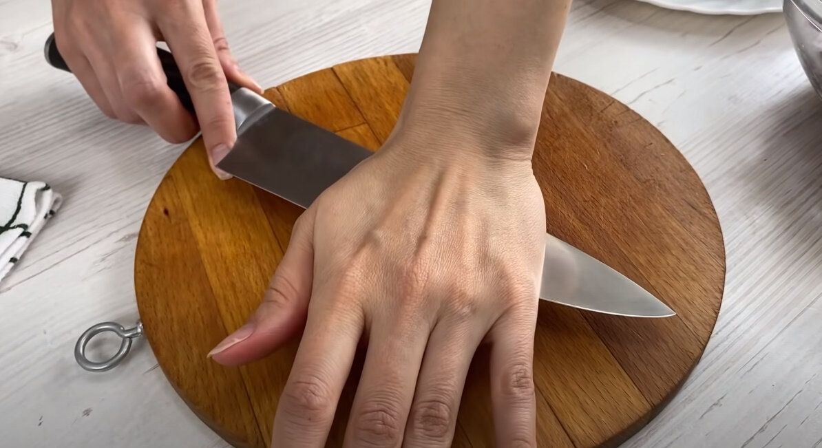Можно пропустить через пресс, но я его таким вот образом сначала раздавлю ножом,
