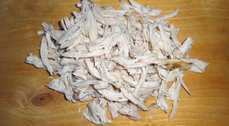 Варёное куриное мясо мелко нарезать или разобрать на волокна. Для нарезания мяса мне бы подошла разделочная доска с ножеточкой от бренда Joseph Joseph. Очень удобное приспособление из серии "2 в 1". Не нужно тратить время и искать ножеточку, если затупился нож: всё по рукой.