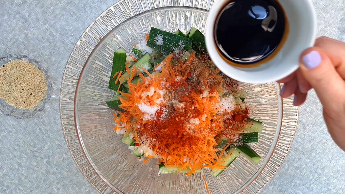 Даль заправляем салат специями, соей, уксусом — кладем все, кроме кунжута. Его будет добавлять в самом конце.
